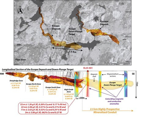 Dem Unternehmen wurden im Rahmen des Ontario Junior Exploration Program (OJEP) staatliche Fördermittel in Höhe von bis zu 200.000 $ bewilligt, die zur Weiterführung der Arbeiten im 2,5 km langen im Einfallen liegenden Zielgebiet „Escape" verwendet werden sollen, wo kürzlich in der ersten Explorationsbohrung eine 53 m mächtige Mineralisierung mit ähnlichen Gehalten wie die Ressource durchschnitten wurde (Abbildung 1 und Pressemitteilung vom 20. Oktober 2025).